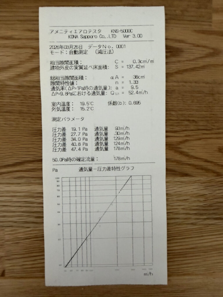 この数値は、私たちの家づくりの「施工精度」そのものを表しています。 今回も、熟練の職人さんたちが細部まで一切の妥協なく、丁寧に施工していただいたおかげで、非常に高い気密性能を確保することができました。