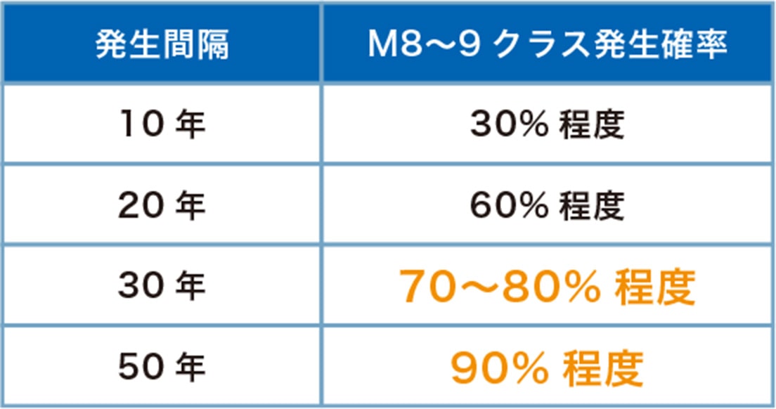 地震調査研究推進本部(文部科学省研究開発局地震・防災研究課 )によると、南海地震の発生確率は、今後30年以内で70~80%程度、50年以内は90%程度にも及んでいます。