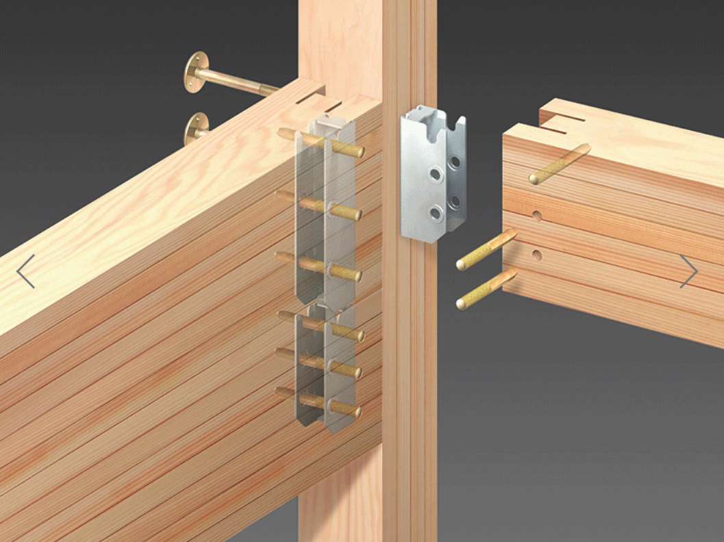 専用のピンで木材同士の接合をすることで、地震の弱点でもあった断面欠損を最小限に留めます。