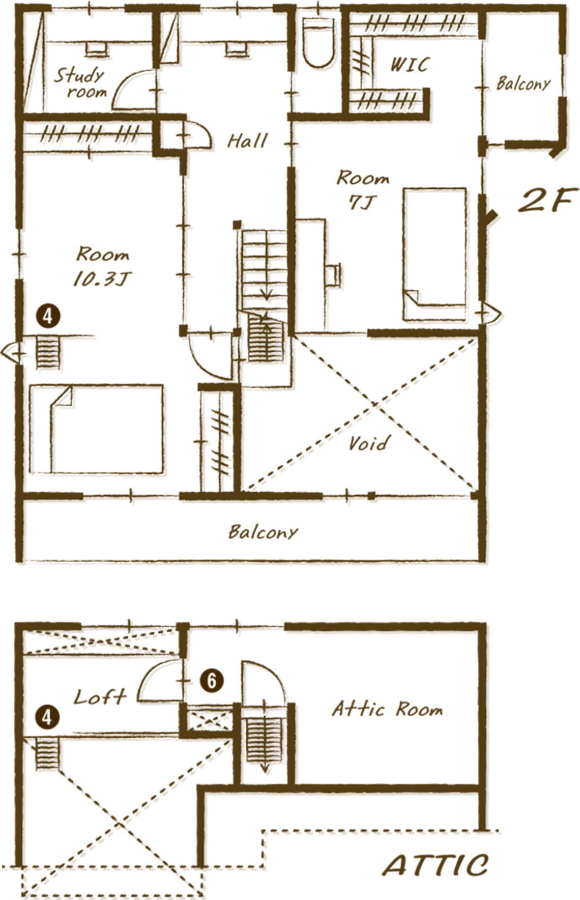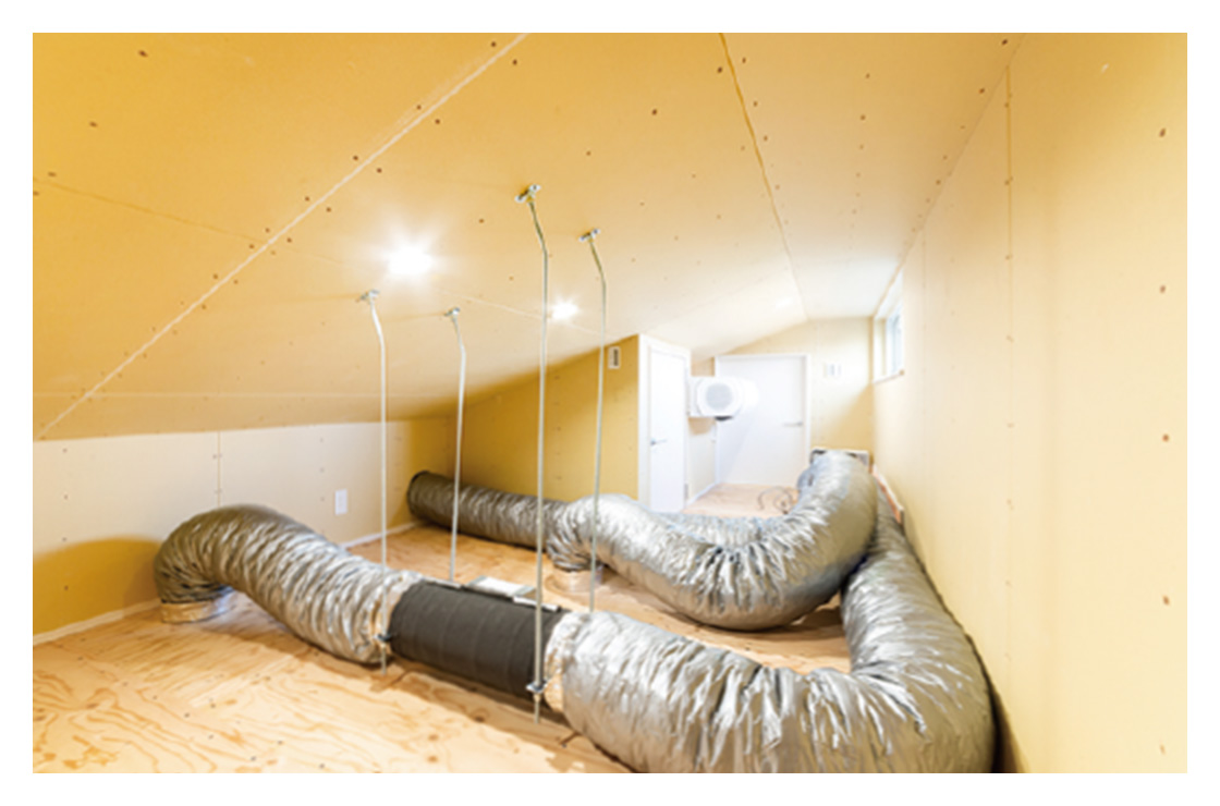 小屋裏に設置したエアコンで冷暖房を行い、換気ファンを通じて各部屋へ空気を送ります。特に冷房効果が高く、夏場の快適性を高めます。