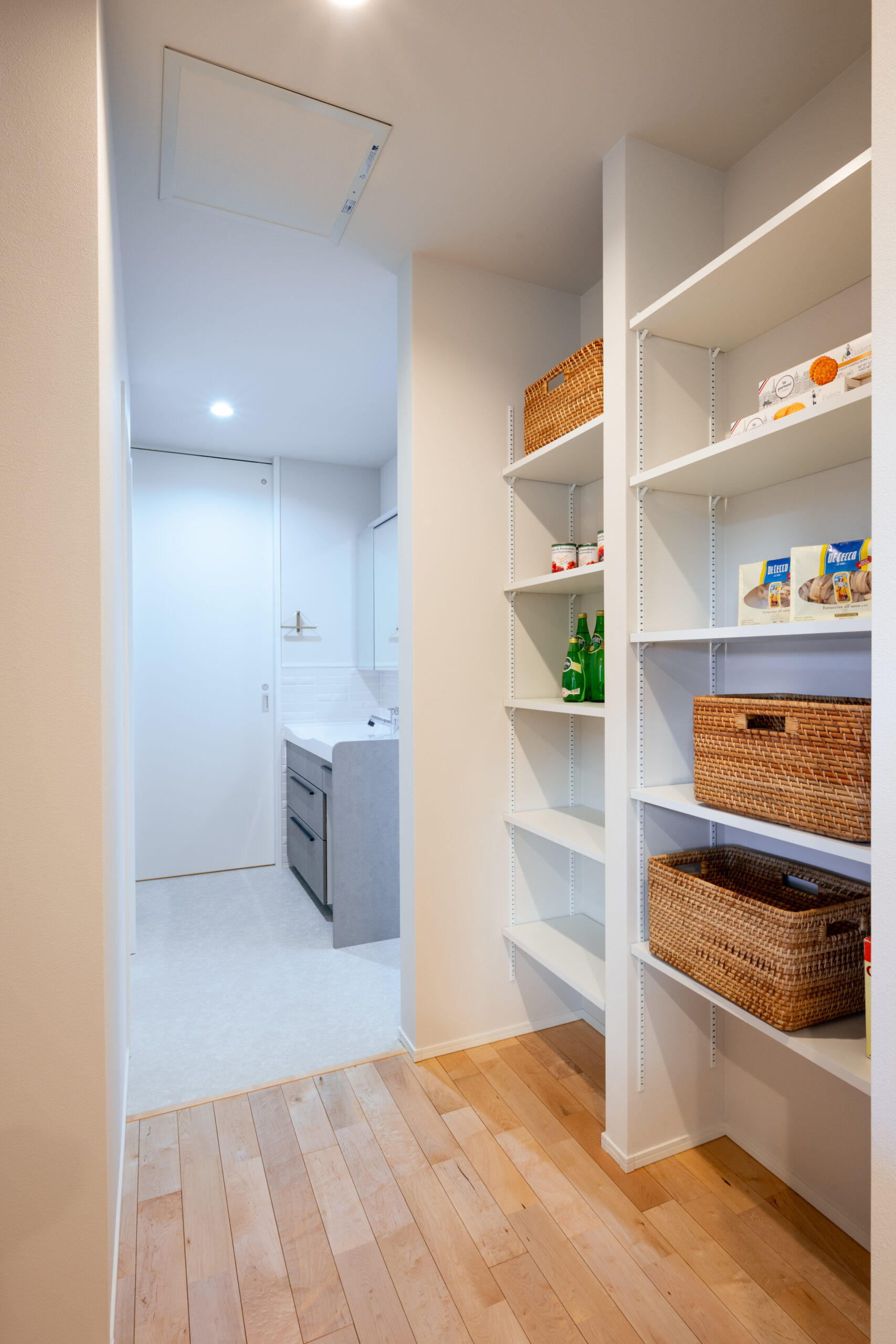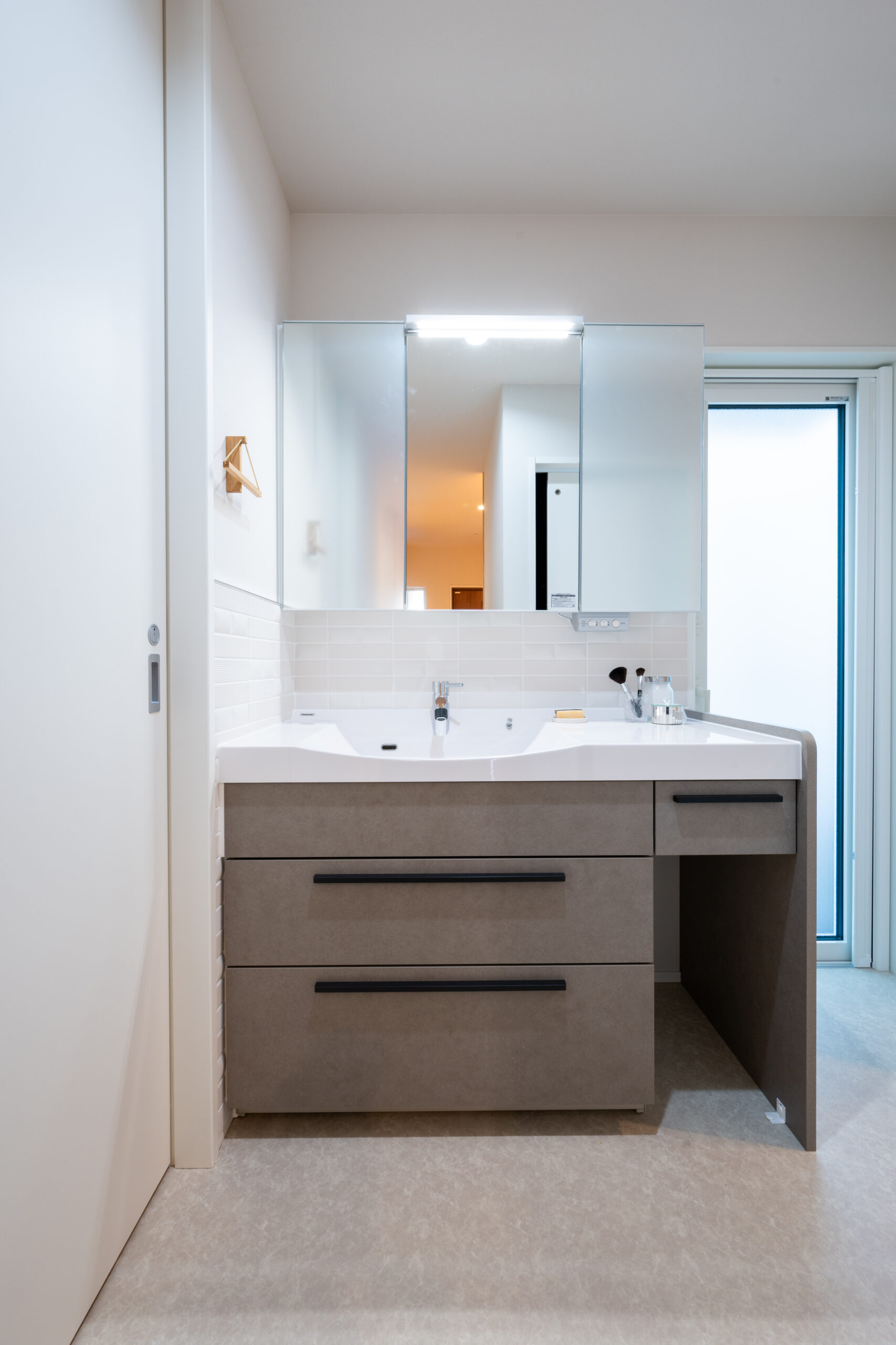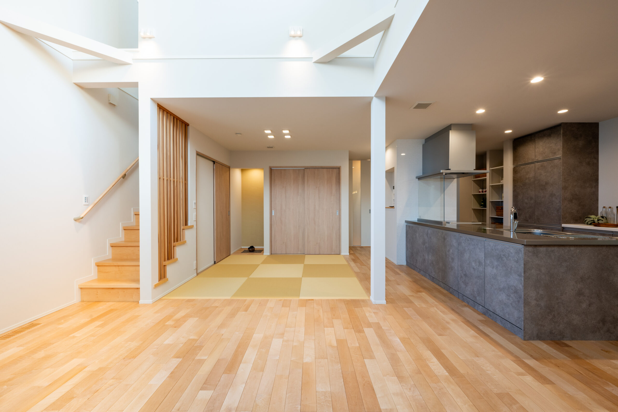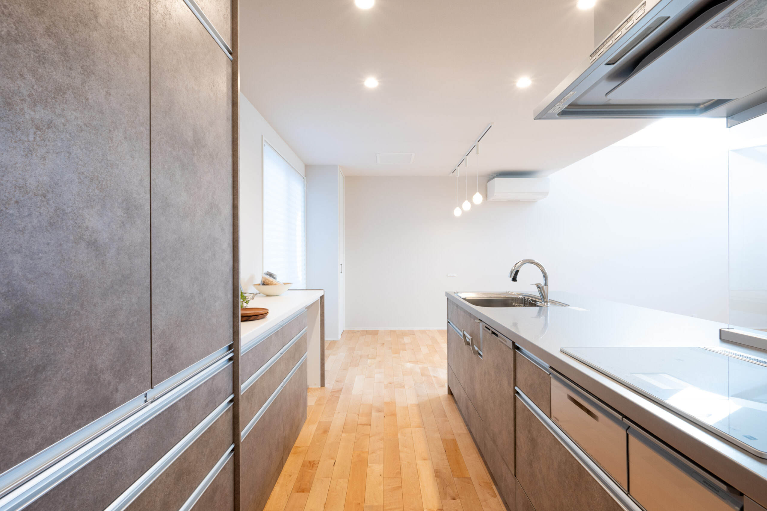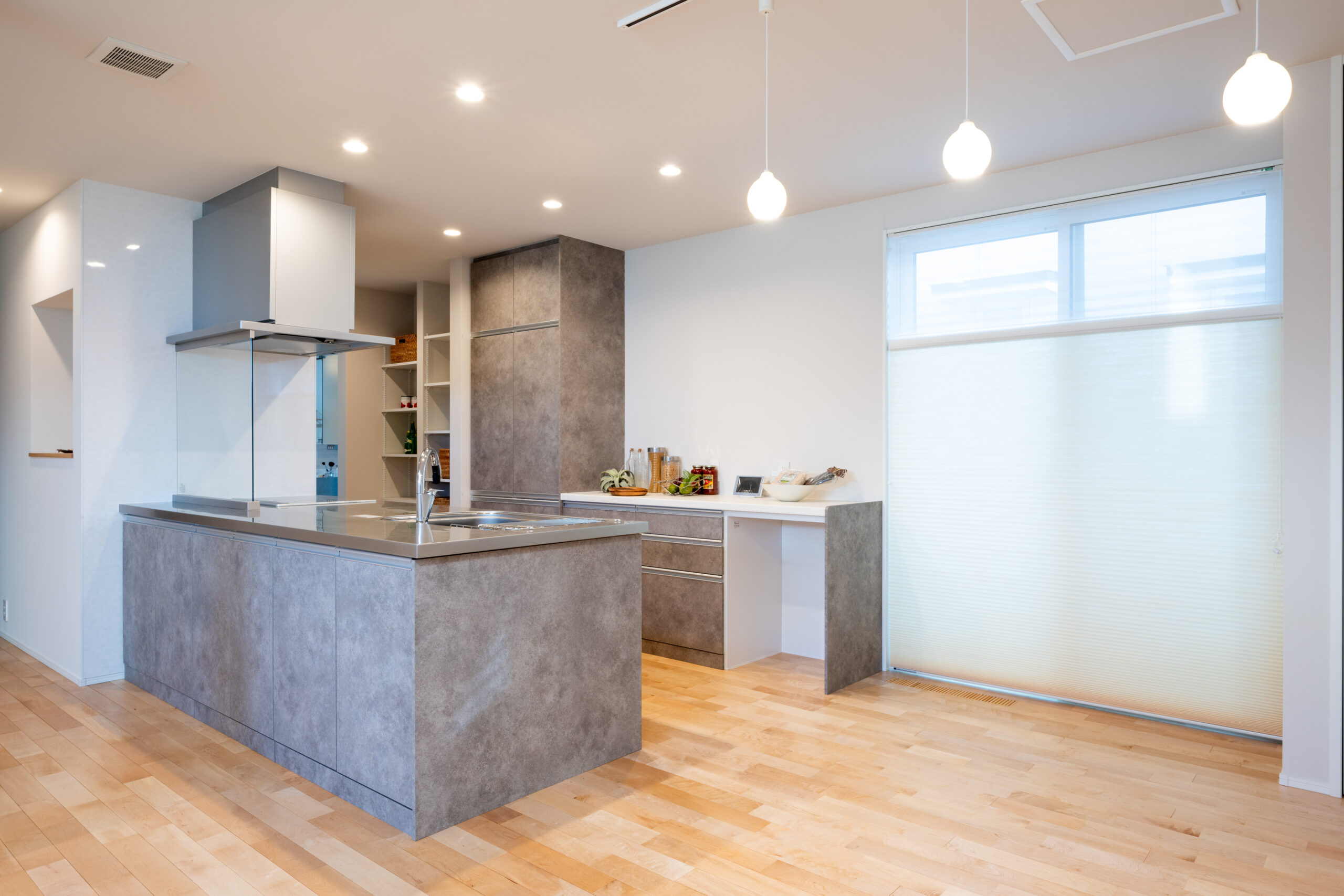 【松山市 注文住宅】グレーキッチンが主役の白と木目が調和する家