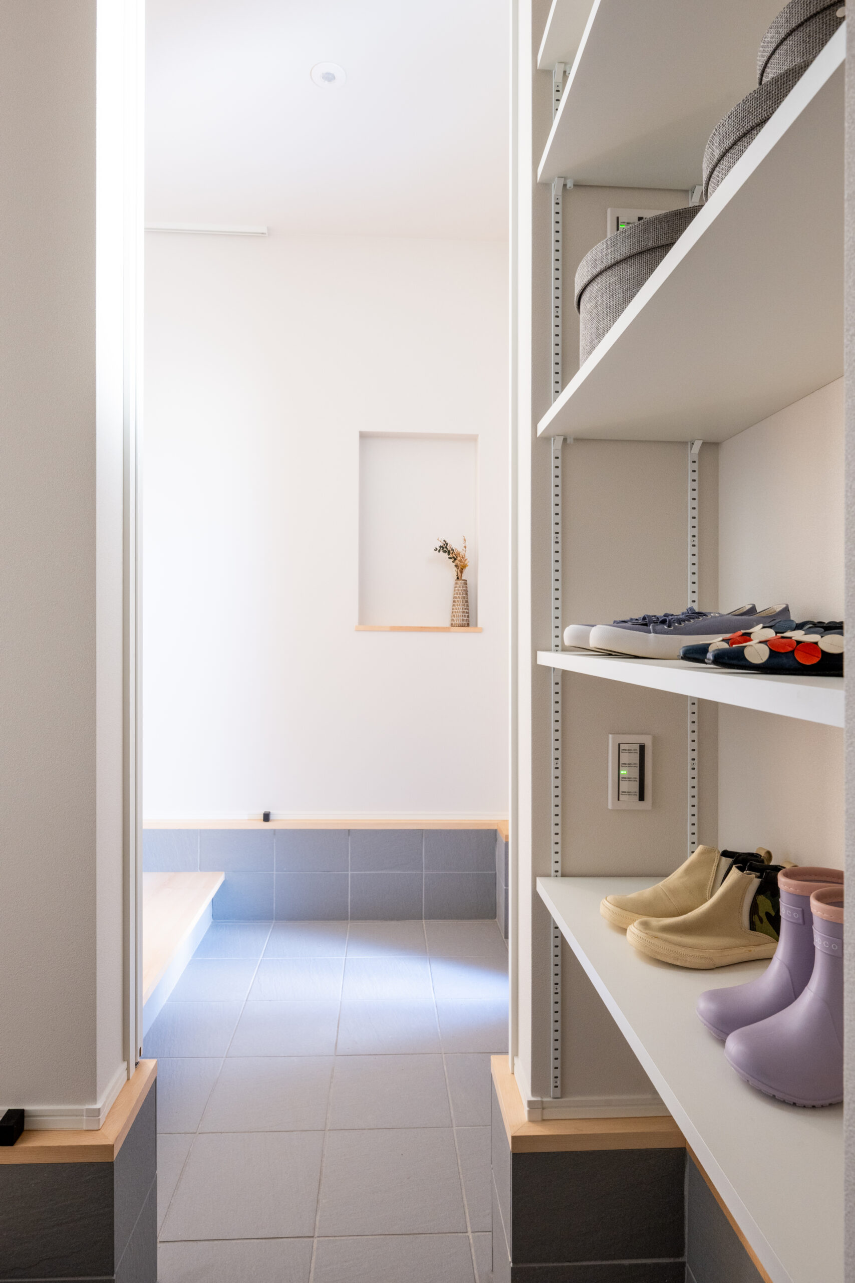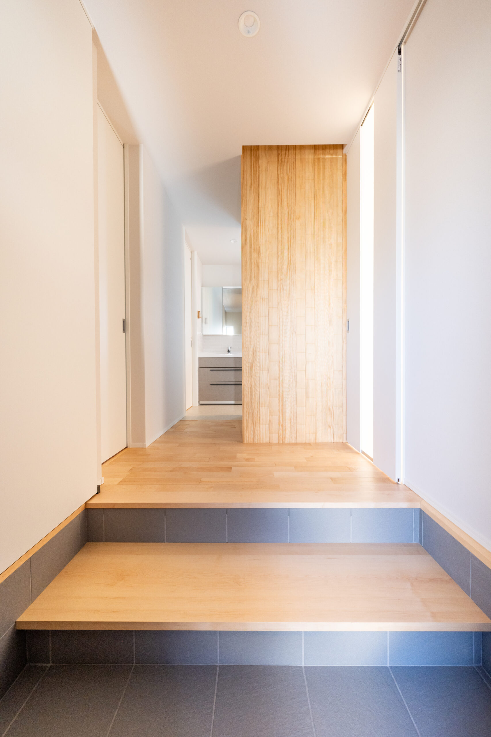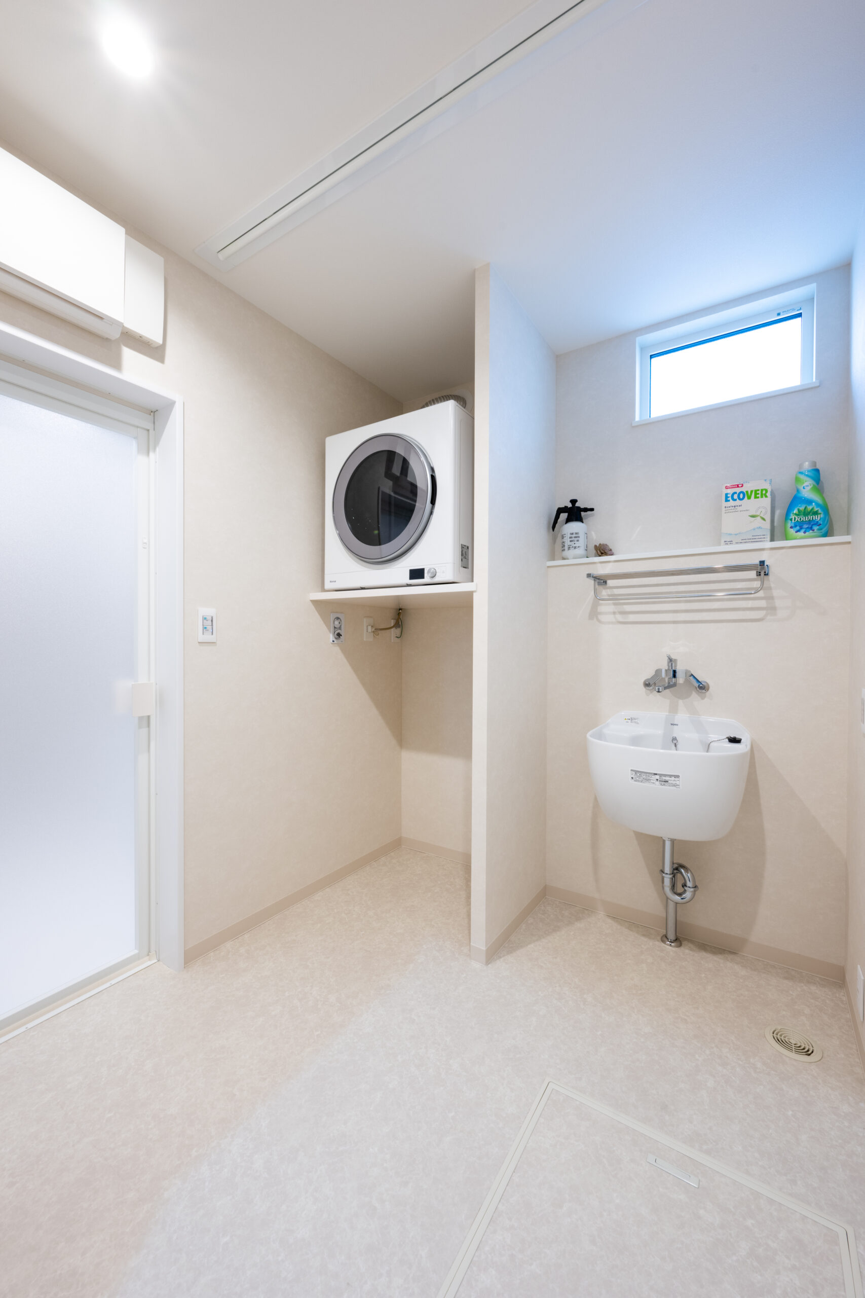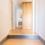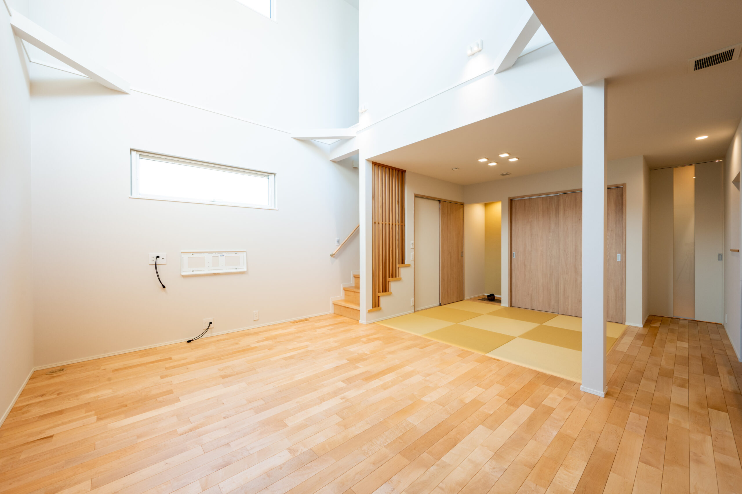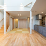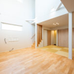 性能面では、C値0.3・UA値0.37という高い気密・断熱性能を実現。冬は床下エアコン1台で家全体を足元からあたため、夏は2階に設置したエアコンで冷気をためて各室へ送風することで、少ない台数のエアコンでも一年中快適に過ごせる全館空調の住まいです。